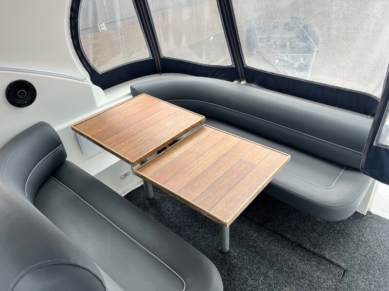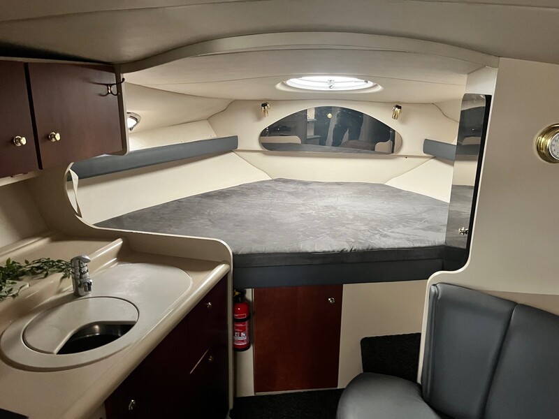 Via en stor svømmeplatform kommer du ind i det praktisk opdelte cockpit på denne Cruiser Yachts 3075 Rogue, hvor komfortable bænke er placeret på styrbord side. Et vidunderligt sted med en smuk udsigt over vandet. Længere fremme er det fuldt udstyrede cockpit, herfra kan man nå fordækket via et gennemgangsvindue. Under dæk giver det åbne layout og det lyse interiør en rummelig følelse. Overfor den kompakte kabys ligger salonen, hvor du har en behagelig lædersofa og spisebord til din rådighed. I stævnen er en lounge, der også kan fungere som gæstekøje. Ejerens kaj er placeret i agterskibet, som har tilstrækkelig privatliv gennem et gardin. Badeværelset er udstyret med håndvask, toilet og bruser og er overraskende rummeligt. Der er tilstrækkeligt med skabs- og opbevaringsplads ombord til tøj og opbevaring, så du ikke skal gå glip af hjemmets komfort. Takket være en indbygget varmelegeme kan du også nyde denne yacht komfortabelt på køligere dage.